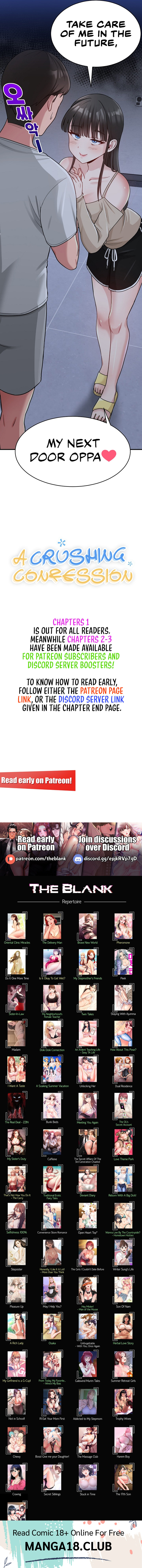 Read the latest manga A Crushing Confession Chapter 1 at manga18fx . A Crushing Confession is always updated at manga18fx . Dont forget to read the other manga updates. A list of manga collections manga18fx is in the Manga List menu.